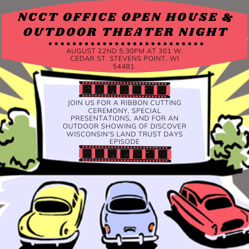 Description: Join NCCT at our Office Open House Event on Saturday, August 22nd, at 301 West Cedar Street, Stevens Point, WI 54481. We will begin with a ribbon-cutting ceremony at 5:30 PM to showcase our newly renovated office space. We will then unveil our new business sign that was constructed entirely by volunteers out of donated materials. We will also have special presentations honoring the individuals who have done some excellent work for NCCT during this time. After the ceremony and special presentations are over, the office and grounds will be open to exploring as long as everyone is practicing safe social distancing procedures. During this time, we will also announce the winners of the conservation easement landowner photo contest and display all the photos on an outdoor projection screen. At around 7:00 PM, we will be airing the Discover Wisconsin's Land Trust Days Episode that came out in June. The episode will be shown outdoors in our parking lot; this way, everyone may sit in their vehicles or bring lawn chairs to enjoy the episode while still social distancing. There will be some final remarks, and the office open house event will officially close at 8:00 PM.