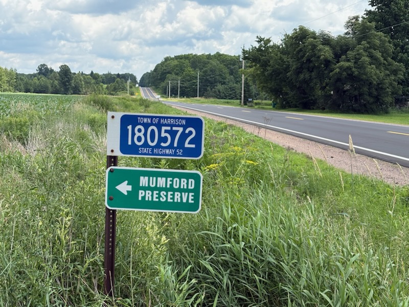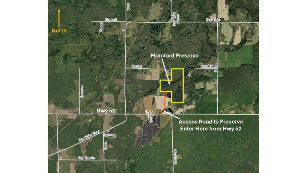 Sign along Hwy 52. Follow the gravel access road towards Mumford Preserve.