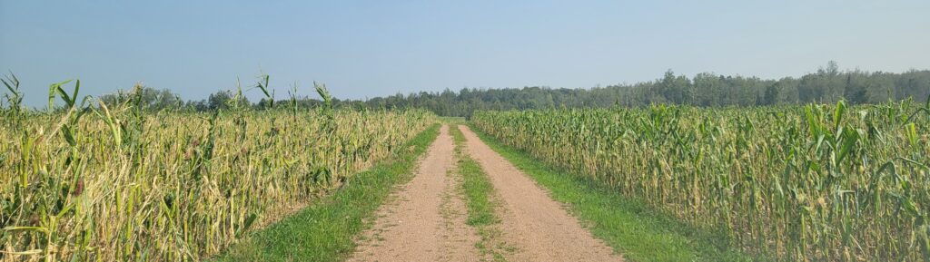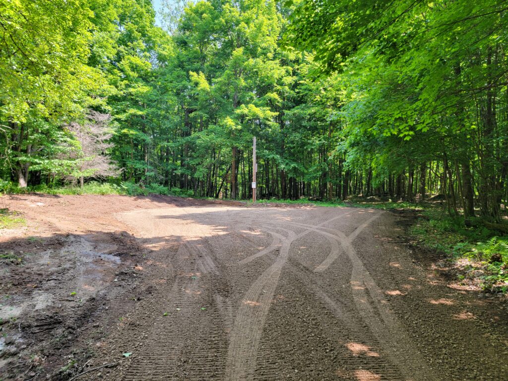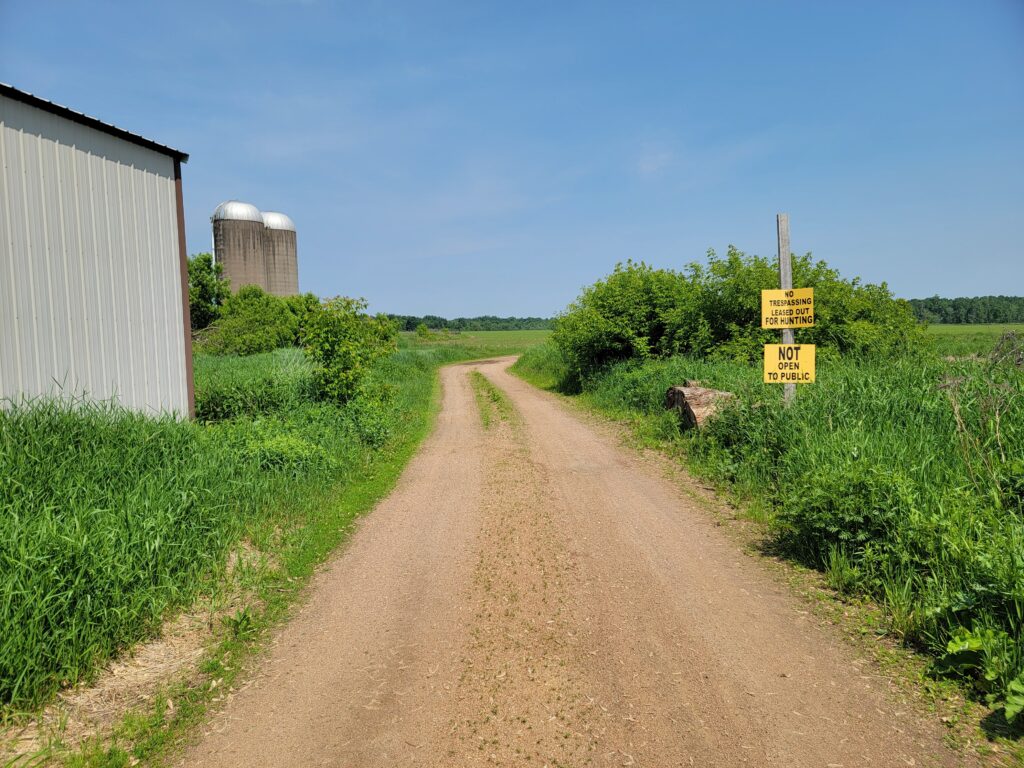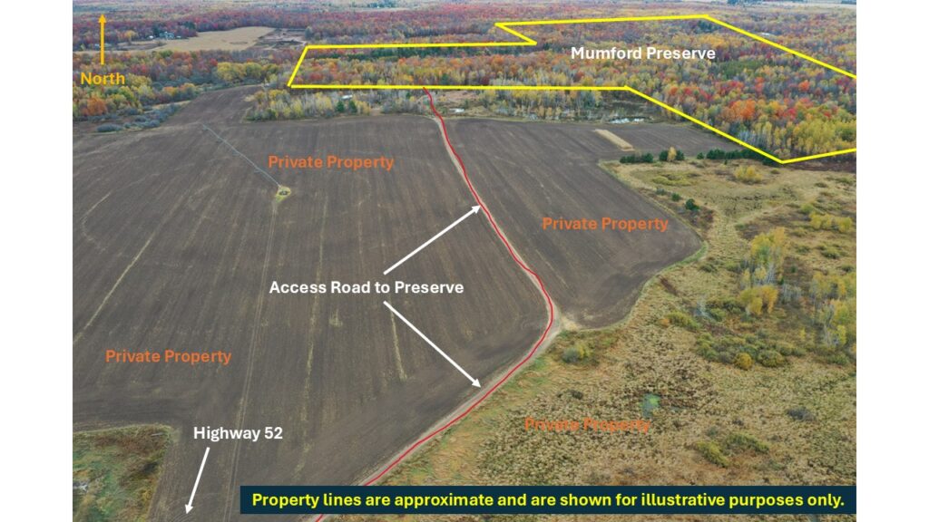 Access road from Hwy 52 towards Mumford Preserve. Drive past the yellow signs, but please stay on gravel access road. Drive down access road until you reach the Mumford Preserve gate, then proceed to Mumford Preserve parking area.
